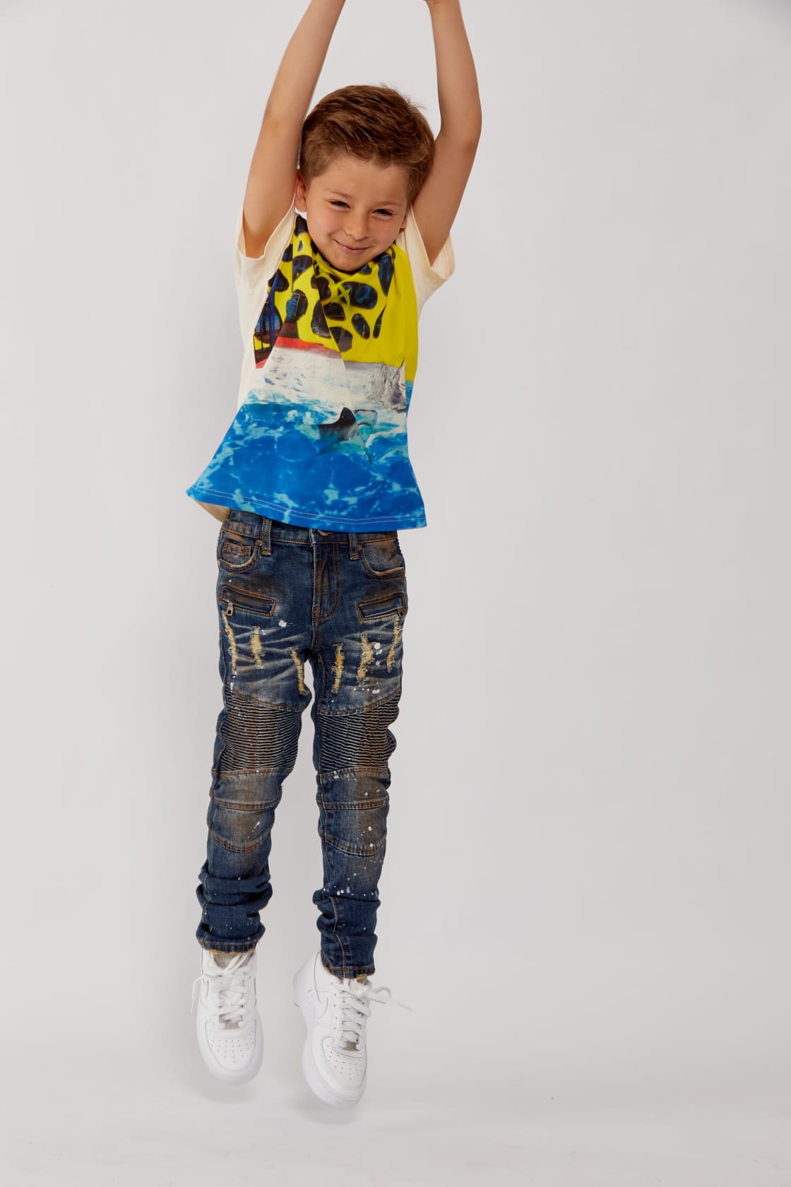 CHICAGO JEANS are made with a 98% cotton and 2% spandex blend, providing a durable and comfortable fit. Available in sizes 2T to 12, these jeans offer a relaxed and stretchy fit that is perfect for kids on the go.